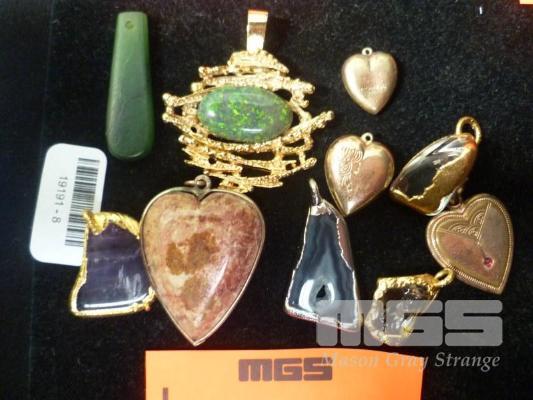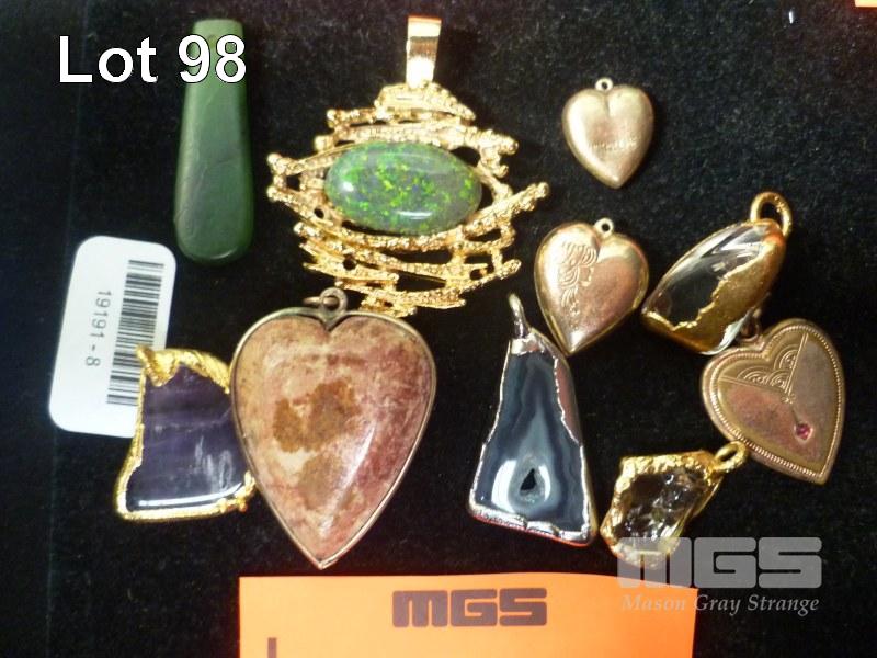 10 x PENDANTS, 4 x SEMI PRECIOUS STONES SET IN GOLD & SILVER COLOURED SETTINGS, 1 x HEART SHAPED STONE PENDANT, 1 x OPAL PENDANT, 3 x GOLD LINED HEART LOCKETS, 1 x JADE PIECE