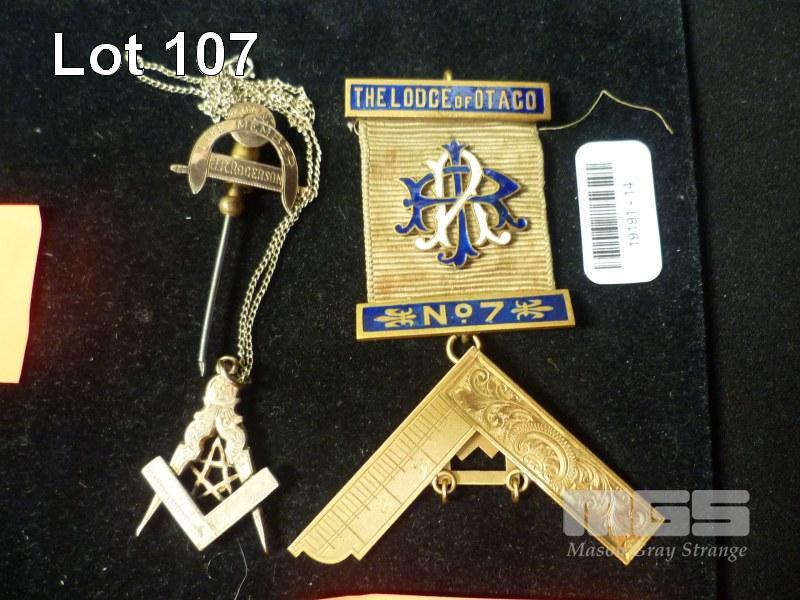 MASONIC LODGE MEDALS, LODGE OF OTAGO NO7, 9cT GOLD, BROTHER ROGERSON, LIFE MEMBER PIN, 9ct, GOLD CHAIN, UNMARKED WITH MASONIC PENDANT, UNMARKED