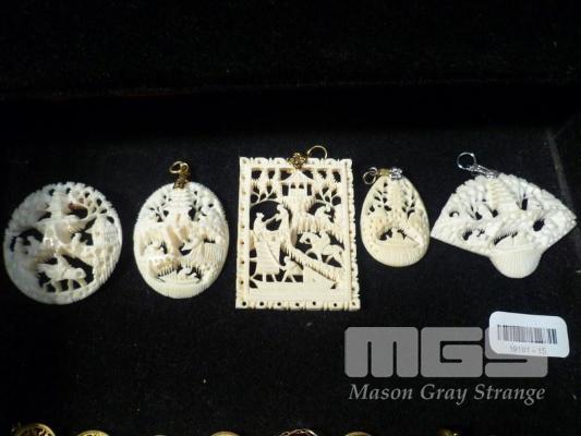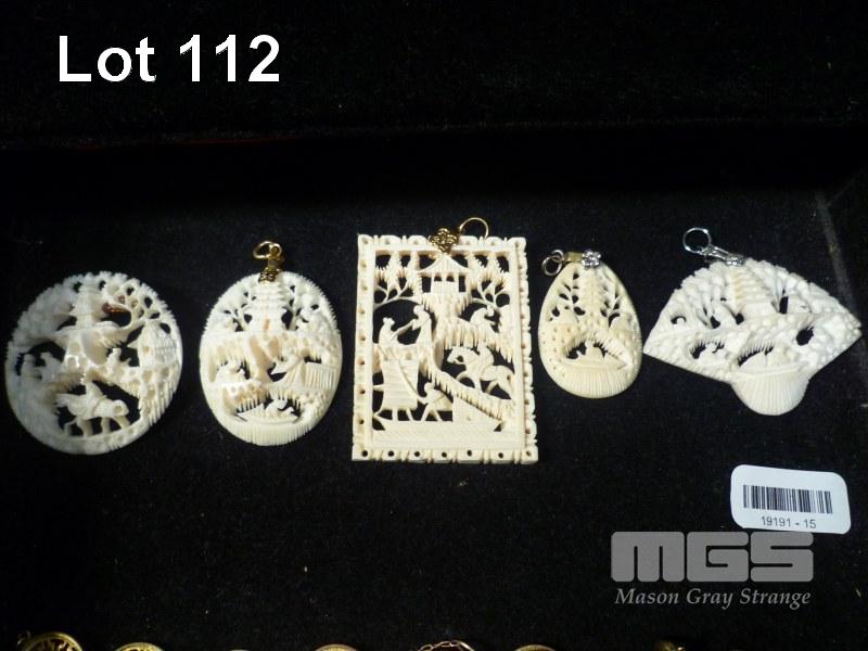 5 x CARVED BONE PIECES, 3 x PENDANTS, 1 x BROOCH, ORNATE CARVING, ORIENTAL STYLE