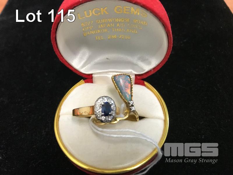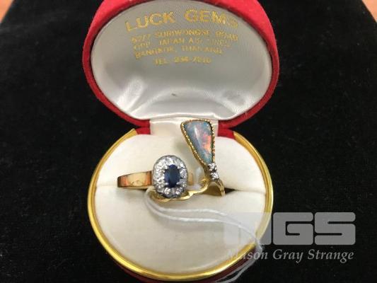 2 X GOLD RINGS MARKED 18CT, 1 X SET WITH SAPPHIRE & DIAMONDS SIZE 7.5, 1 X OPAL SIZE 7 (US) 8.65 GRAMS TOTAL