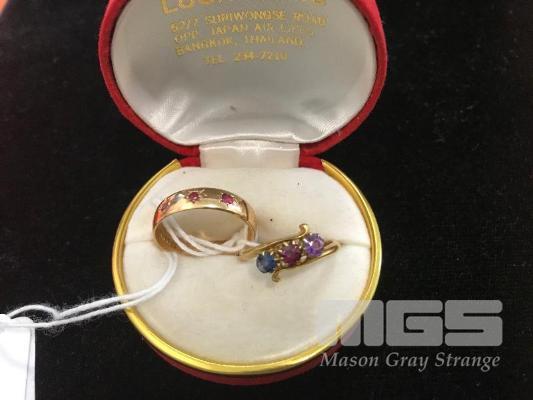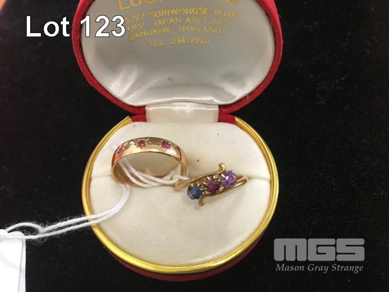 2 X GOLD RINGS MARKED 18CT, 1 X SET WITH 3 X SMALL RUBIES SIZE 7, 1 X RED, BLUE & PURPLE GEMSTONES SIZE 6 (US) 6.3 GRAMS TOTAL
