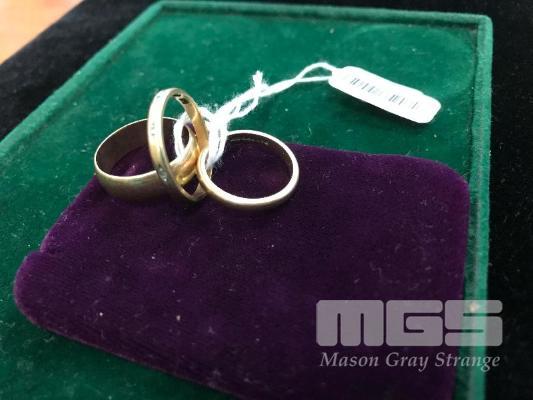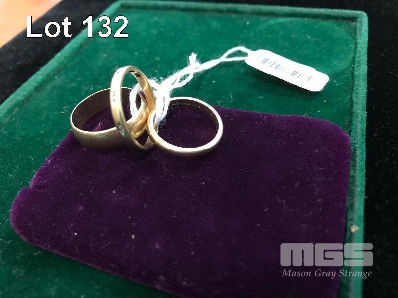 3 X GOLD WEDDING RINGS MARKED 9CT, 2 X PLAIN SIZE 5.5 & 7, 1 X SET WITH 3 X SMALL CLEAR STONES SIZE 7.5, 7.5 GRAMS TOTAL