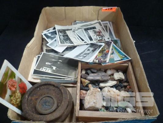 ASSORTED VINTAGE PHOTOS (SOME MILITARY), POSTCARDS & ROCKS N MININERALS, 1 x BOX