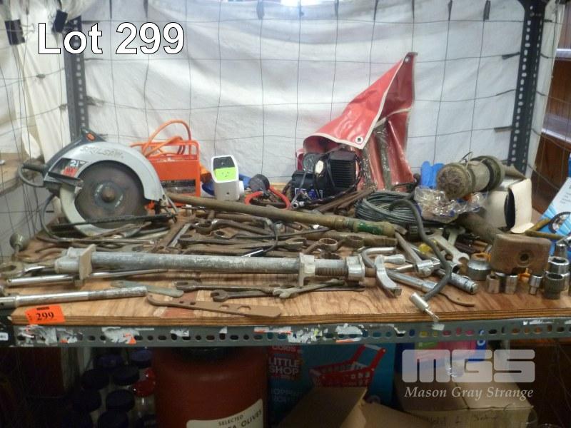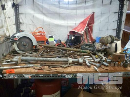 CUT OFF SAW, ASSORTED SPANNERS & SOCKETS, MECHANICS TOOLS & AIR COMPRESSOR, 1 x BAY