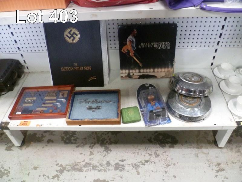 BRUCE SPRINGSTEEN BOXED SET, (WATER DAMAGE TO BOX), 2 x HOLDEN HUB CAPS, ET ACTION FIGURE, POPE JOHN PAUL II MEDALLION, FRAMED FALCON BADGES & GOLF MEMORABILIA