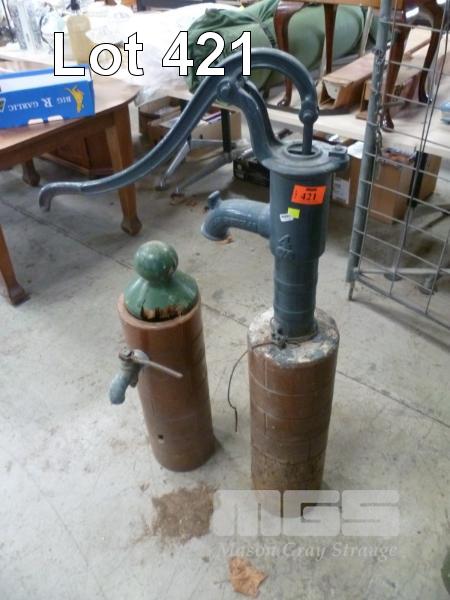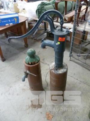 W&B DOUGLAS, MONKEY TAIL, WATER PUMP ON CONCRETE STAND WITH VINTAGE TAP ON CONCRETE STAND