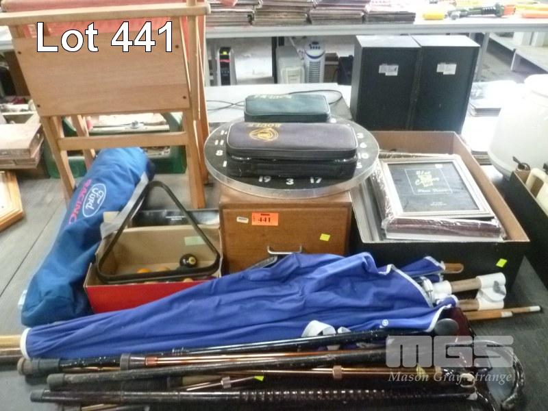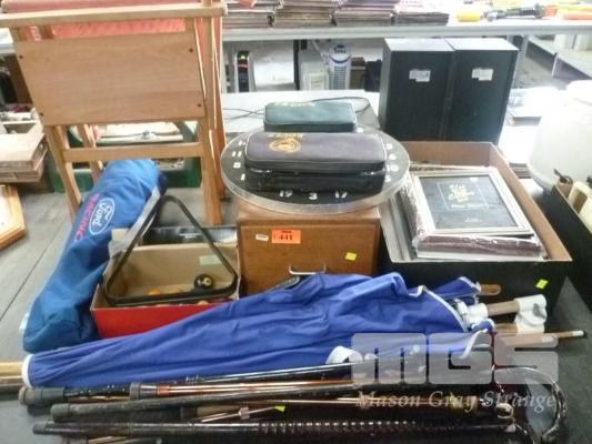 FORD RACING CAMP CHAIR, FOSTERS UMBRELLA, WALKING AIDS, POOL CUES & BALLS, PICTURE FRAMES, ETC