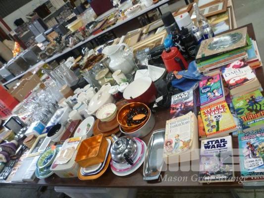 ASSORTED HOMEWARES, GLASSWARE, BOOKS, KITCHENWARE, ETC, 1 x TABLE