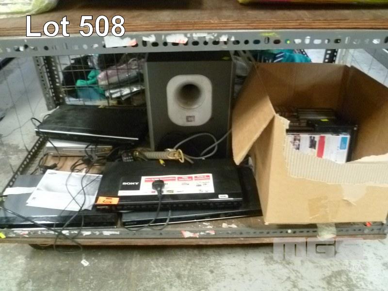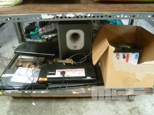ASSORTED DVD PLAYERS, JBL SUB WOOFER, HD RECEIVER, SLIDE PROJECTOR, CD'S & DVD'S