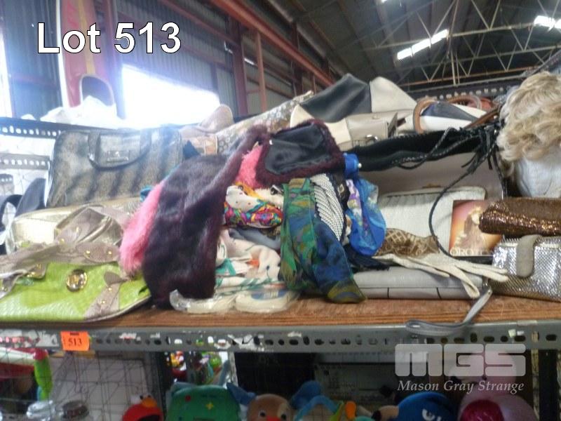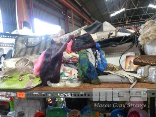 ASSORTED LADIES HANDBAGS, (1 x MARKED GIANNI VERSACE), SCARVES, FUR, CLUTCHES, PURSES, (SOME GLOMESH), WIG & CUSHIONS, 1 x BAY