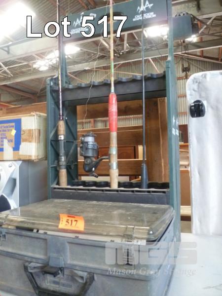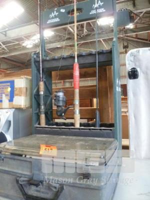 FISHING RODS, STAND & PIANO TACKLE BOX & CONTENTS ASSORTED TACKLE