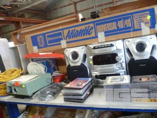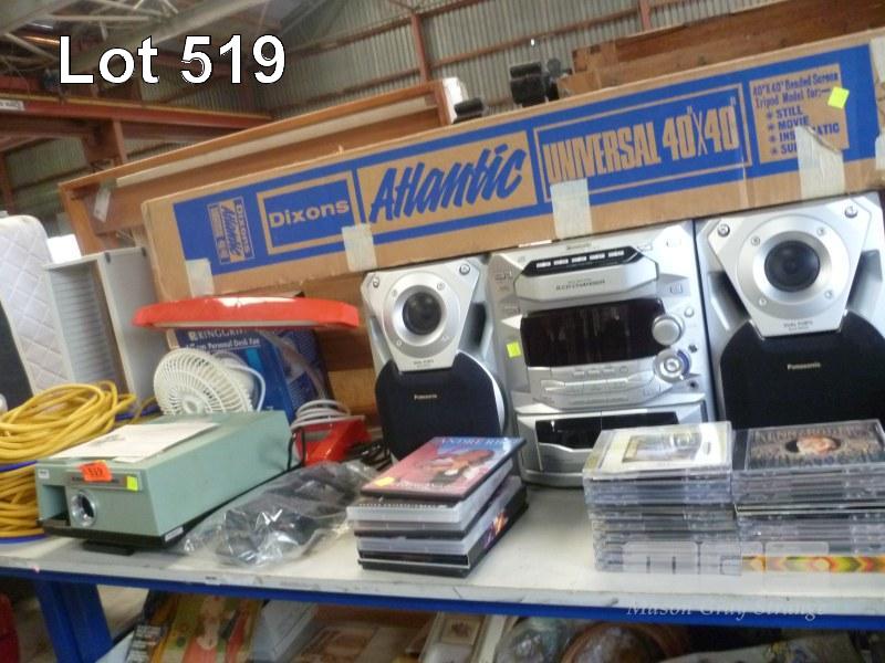 PANASONIC CD STEREO SYSTEM, SA-AK18, ASSORTED CD'S/DVD'S, PRINZ CONCORD SLIDE PROJECTOR & SCREEN, DESK FANS, EXTENSION CORDS & RED FAIRSKY DESK LAMP