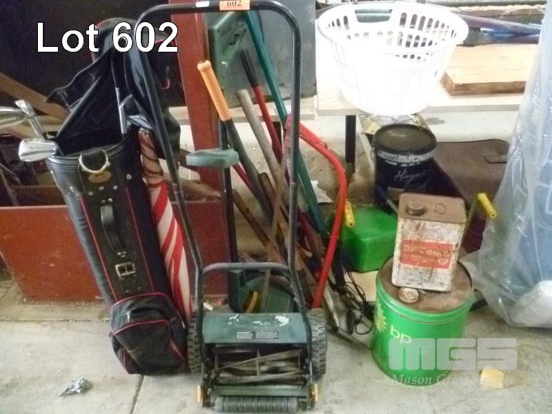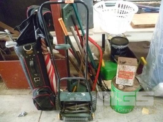 ASSORTED GARDENING EQUIPMENT, GOLF BAG & CLUBS & 2 x BP TINS