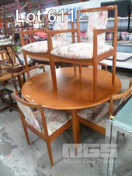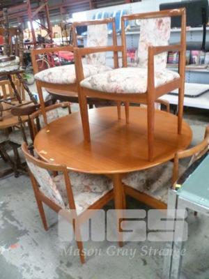 TEAK 7 PIECE DINING SUITE INC ROUND EXTENSION TABLE, 4 x DINING CHAIRS & 2 x CARVER CHAIRS