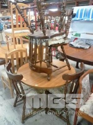 ROUND TIMBER LAMINATE TOP DINING TABLE, SINGLE PEDESTAL & 4 x PINE DINING CHAIRS, CURVED BACK