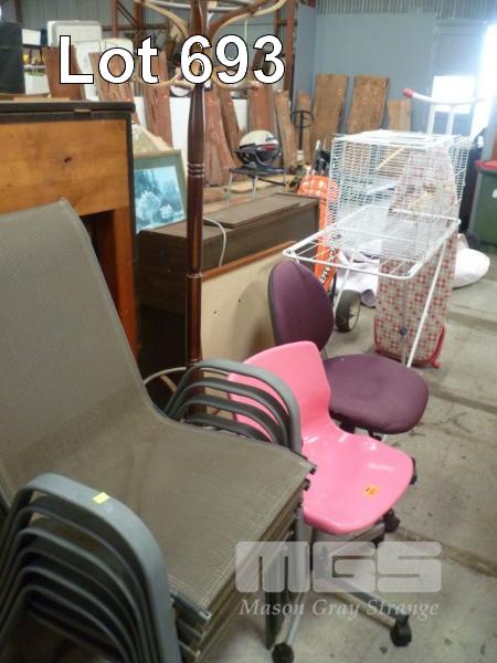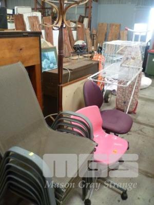 SET 6 ALUMINIUM STACKABLE OUTDOOR CHAIRS, TIMBER HAT STAND, 2 x OFFICE CHAIRS, CLOTHES AIRER, IRONING BOARD, AVERY & PINBOARD