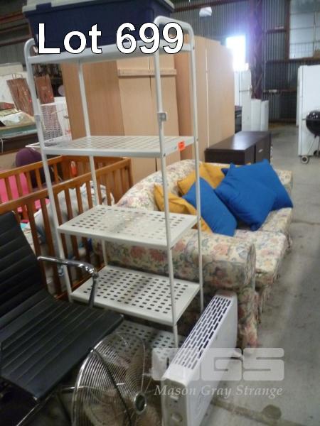 FLORAL FABRIC 2 SEATER LOUNGE, SIDEBOARD, METAL SHELF UNIT, OFFICE CHAIR, PEDESTAL FAN, HEATER & PET CARRIER