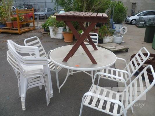 WHITE, ALUMINIUM FRAME, 5 PEICE OUTDOOR SETTING, INC; ROUND TABLE & 4 X CHAIRS, WITH TIMBER FOLD UP TABLE & 6 X WHITE PLASTIC STACKABLE CHAIRS