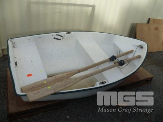 WHITE, FIBREGLASS, DINGHI, LENGTH 2.2 METRES, WITH PAIR OF TIMBER OARS