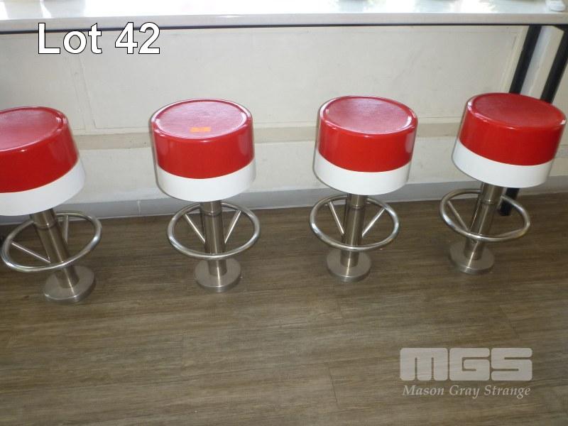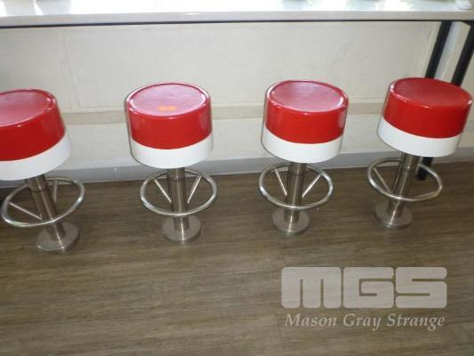 8 x FLOOR MOUNT STOOLS, RED/WHITE PVC, STAINLESS STEEL FRAME,