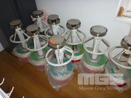 8 x FLOOR MOUNT STOOLS, RED/WHITE PVC, STAINLESS STEEL FRAME, (UPSTAIRS)