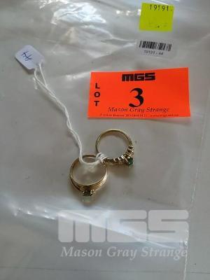 2 X GOLD RINGS MARKED 9CT, 1 X WITH GREEN STONE & SMALL DIAMOND SETTING, 1 X WITH GREEN STONE & DIAMOND CHIP SETTING, SIZE 6.5 & 7 (US) 4.4 GRAMS TOTAL