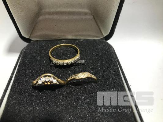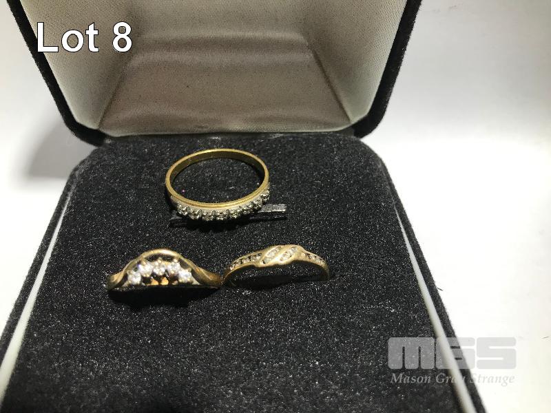 3 X GOLD RINGS MARKED 9CT, 1 X ARCH SHAPED WITH 4 X SMALL DIAMOND SETTING, 2 X WITH DIAMOND CHIPS, SIZES 9.5, 8.5 & 7 (US) 6 GRAMS TOTAL