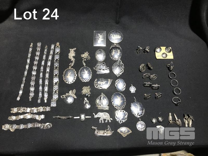ASSORTED SIAM STERLING ETCHED JEWELLERY, 14 X BROOCHES, 8 X BRACELETS, 4 X NECKLACES, 5 X RINGS, 5 X PAIRS OF EARRINGS, 3 X PENDANTS 3 X PAIRS OF CUFF LINKS, 3 X TIE CLIPS