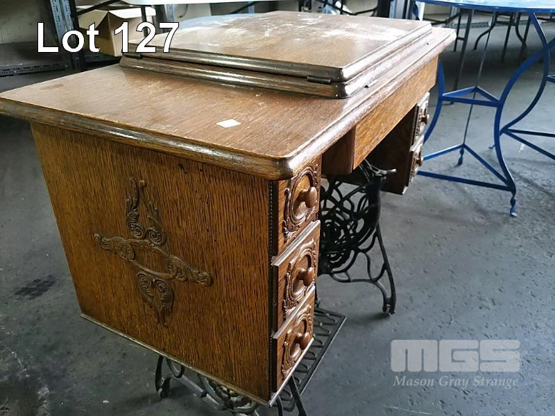 ANTIQUE SINGER SEWING MACHINE, WROUGHT IRON ROTARY TREADLE BASE "SINGER" ON CASTERS, FOLD OUT TABLE, 6-DRAWER WITH SPOOL TRAY.