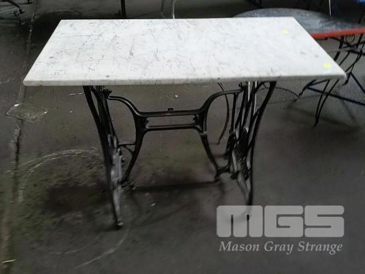 ANTIQUE WROUGHT IRON SEWING MACHINE TABLE "WERTHEIM" IN BLACK ON CASTORS WITH WHITE MARBLE TOP