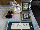 TSAROUCHI SHOES (SIZE 32) AND 4 x FRAMED SKETCHES. 3 x TURKISH SHADOW PUPPETS