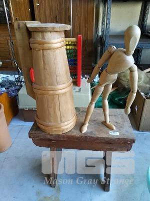 JOINTED ANATOMICAL WOOD DOLL, CURIOUS WOODEN WATER JUG AND VINTAGE RAW TIMBER FOOTSTOOL.