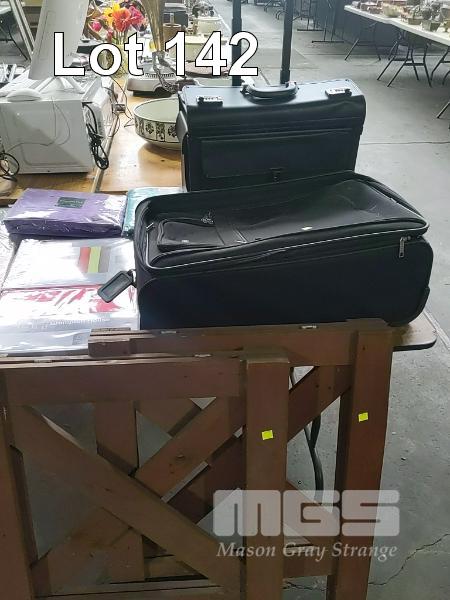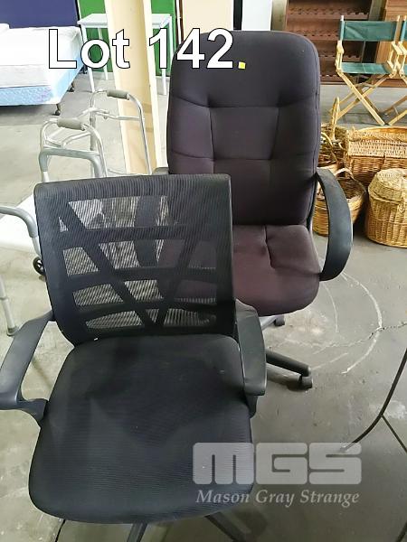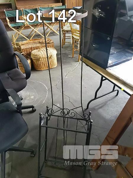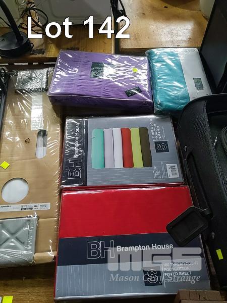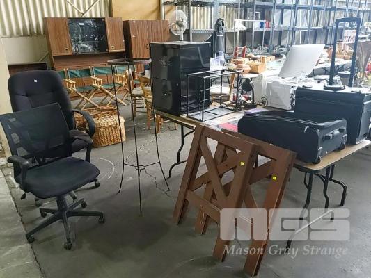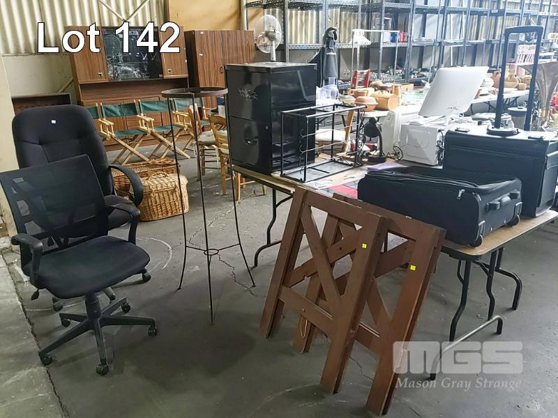 SUITCASE, TROLLEY BRIEFCASE, 2-DRAWER FILING CABINET, IKEA "SUMMERA" COMPUTER HOLDER (NEW IN PACKAGING), SHEETS (NEW ON PACKAGING), WOODEN TABLE TRELLISES, 2 x GAS LIFT OFFICE CHAIRS AND METAL POT STAND ETC