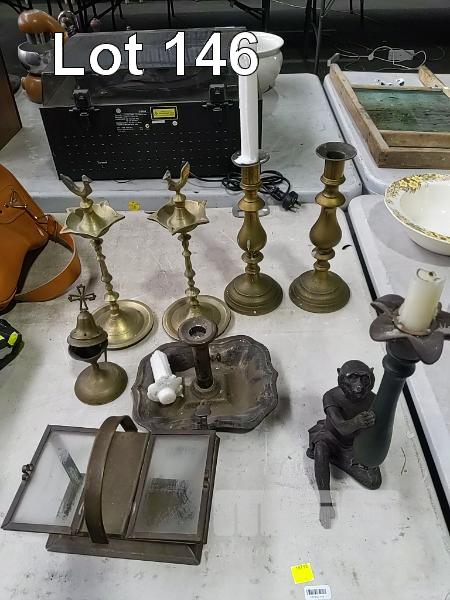 BRASS CANDLESTICK HOLDERS, ANTIQUE CANDLE TRAY AND OTHER METALLIC ORNAMENTS