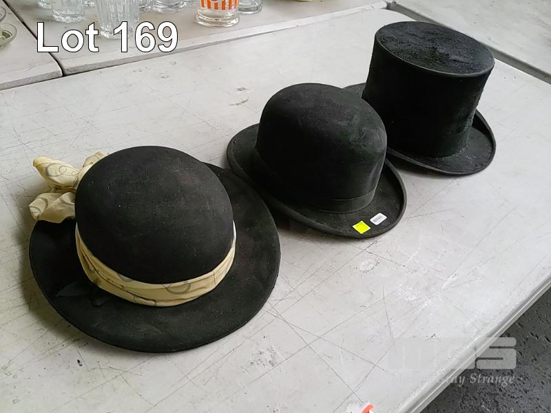 VINTAGE TOP HAT AND 2 x BOWLER HATS "ALL FUR THE CENTAR" AND "THE DON"