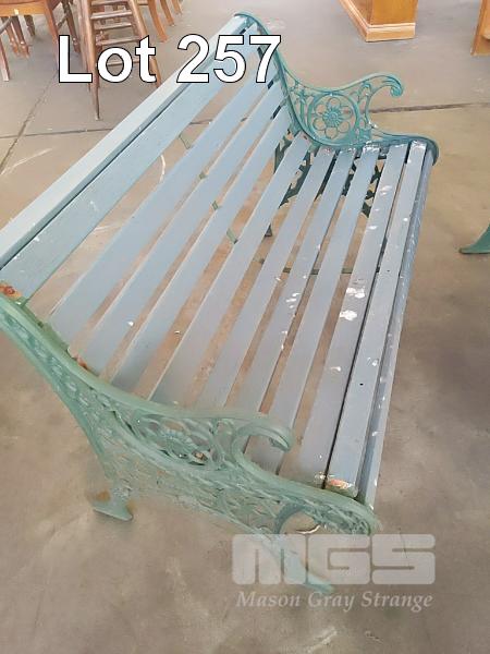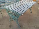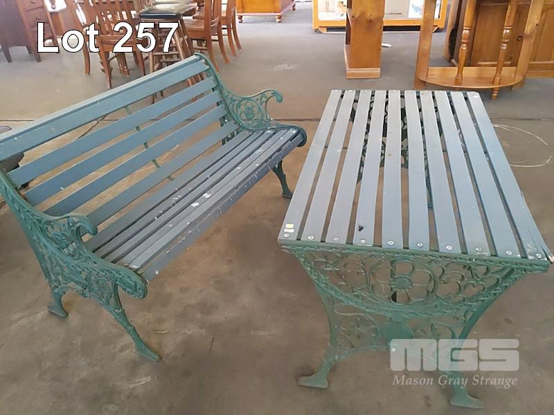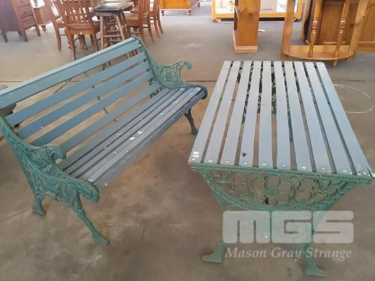 GARDEN BENCH SEAT AND TABLE, WOODEN SLATS WITH CAST ALLOY ENDS.