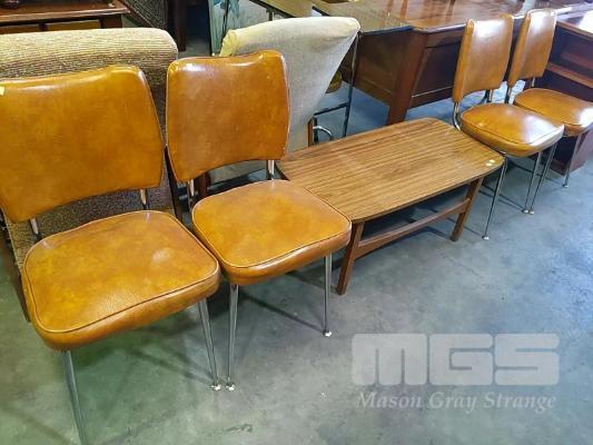 WOOD GRAIN STYLE 1970's TIMBER LAMINATE COFFEE TABLE AND 4 x CONTEMPORANEOUS VINYL & STEEL CHAIRS
