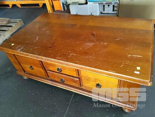 4-DRAW MAHOGANY STAIN TIMBER COFFEE TABLE AND 2 x MATCHING SIDE TABLES