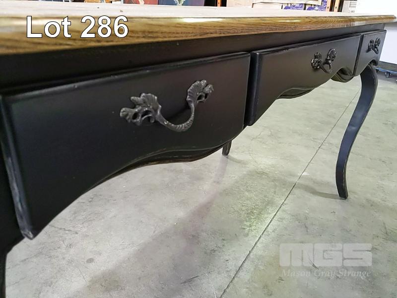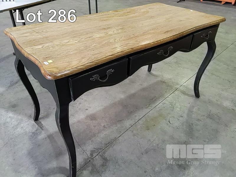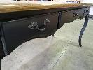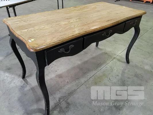 MANCHURIAN OAK TOPPED TABLE WITH SABRE LEGS. 3-DRAWERS WITH BAROQUE METAL HANDLES. 1,500 x 750mm