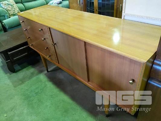 MID-20TH C. VINTAGE TIMBER LAMINATE SIDEBOARD WITH 4-DRAWERS AND TWO SLIDING DOORS.