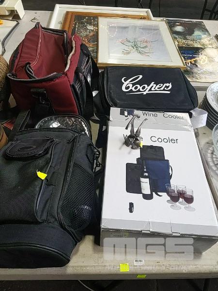 4 x WINE COOLER BAGS/COOLER BAGS (ONE NEW IN BOX) AND CHAMPAGNE CORK EXTRACTOR.
