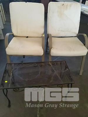 2 x ALUMINIUM OUTDOOR CHAIRS WITH CUSHIONS AND SMOKED GLASS TOPPED STEEL GARDEN TABLE