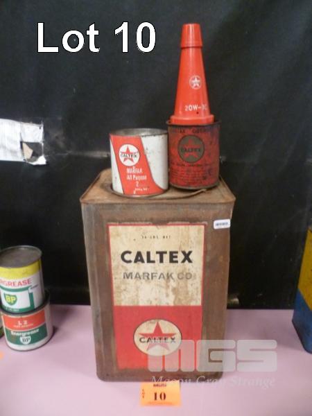 4 x CALTEX ITEMS, INC, 2 x MARFAK GREASE TINS, 1 x 36LB, 1 x 500gm, EARLY CALTEX GREASE TIN, 1LB & 1 x PLASTIC OIL BOTTLE TOP WITH DUST CAP