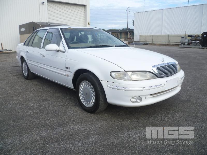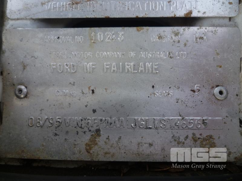 1995 FORD FAIRLANE GHIA SEDAN REG: NO PLATES (EXPIRED) VIN: 6FPAAAJGLWST46565 ENG: JGLWST46565 ODO: 263,066 KM V8 5.4 LITRE, 4 SPEED AUTOMATIC, PETROL/LPG, WHITE, 4 DOORS, 5 SEAT, ABS, AIR BAG, AIR CON, ALLOY WHEELS, CD PLAYER, CRUISE CONTROL, POWER STEERING, POWER WINDOWS, SPARE WHEEL, PREV PLATE # VSW-919 (NO PAPERS, WITH 2 KEY/S, WITH OWNER'S MANUAL, NO SERVICE BOOKS) CONDITION: WINDSCREEN - CRACK ALONG BASE BONNET - STRUTS REQUIRE REPLACEMENT