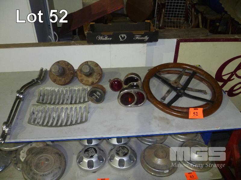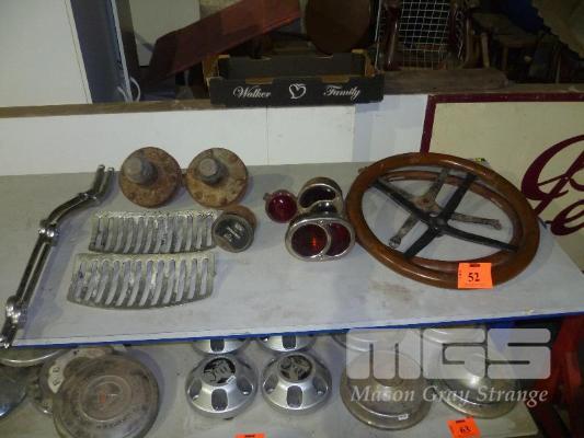2 X TIMBER STEERING WHEELS SPEEDOMETRE GAUGE, 3 X ASSORTED LIGHTS 2 X WHEEL HUBS, 2 X CHROME GRILLS, 2 X CHROME BRACKETS (NO PAPERS, NO OWNER'S MANUAL, NO SERVICE BOOKS)