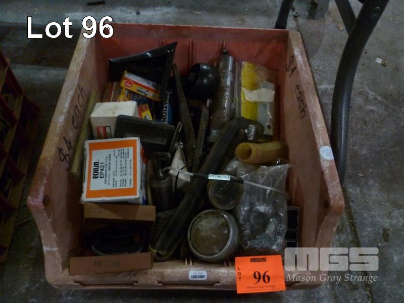 CRATE OF CAR COMPONENTS, SPARK PLUGS SPEEDOMETERS ETC