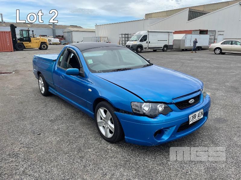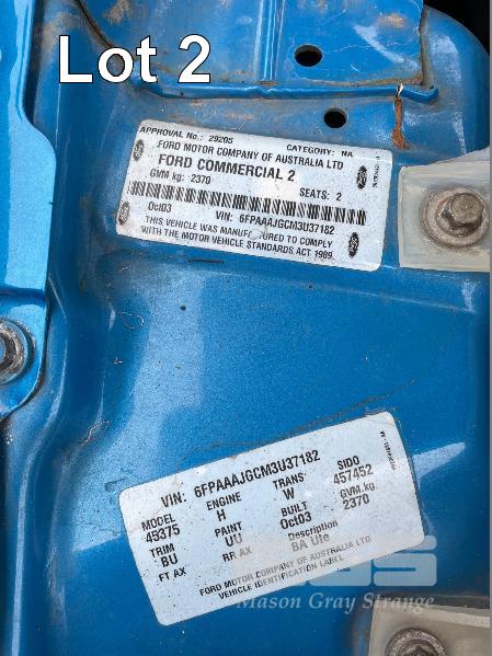 10/2003 (CP) FORD BA XR6 UTILITY REG: S388 AEN VIN: 6FPAAAJGCM3U37182 ODO: 298,468kms SHOWING 4 LITRE 6 CYLINDER, 4 SPEED AUTOMATIC TRANSMISSION, TURBO PETROL, BLUE DUCO, 2 DOORS, 2 SEAT, RWD ABS, AIR BAG, AIR CON, ALLOY WHEELS, CD PLAYER, CENTRAL LOCKING, CRUISE CONTROL, POWER STEERING, POWER WINDOWS, TONNEAU COVER, TOW BAR, TUB LINER **DEFECTED** CRACKED WINDSCREEN (SUSPENSION, TYRES & MIRRORS HAVE BEEN ATTENDED TO) KEY #2 (WITH 1 KEY/S) CONDITION: FRONT BUMPER - SCRATCHES DENTS, INTERIOR TRIM DAMAGE