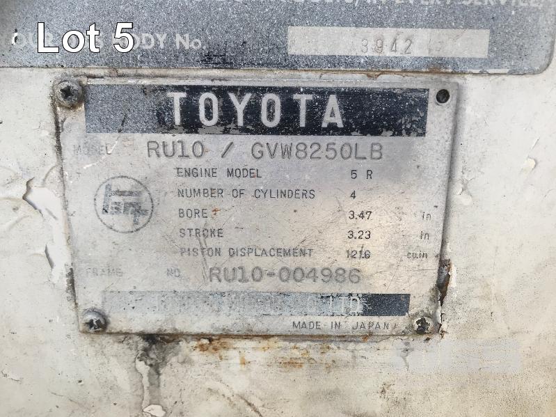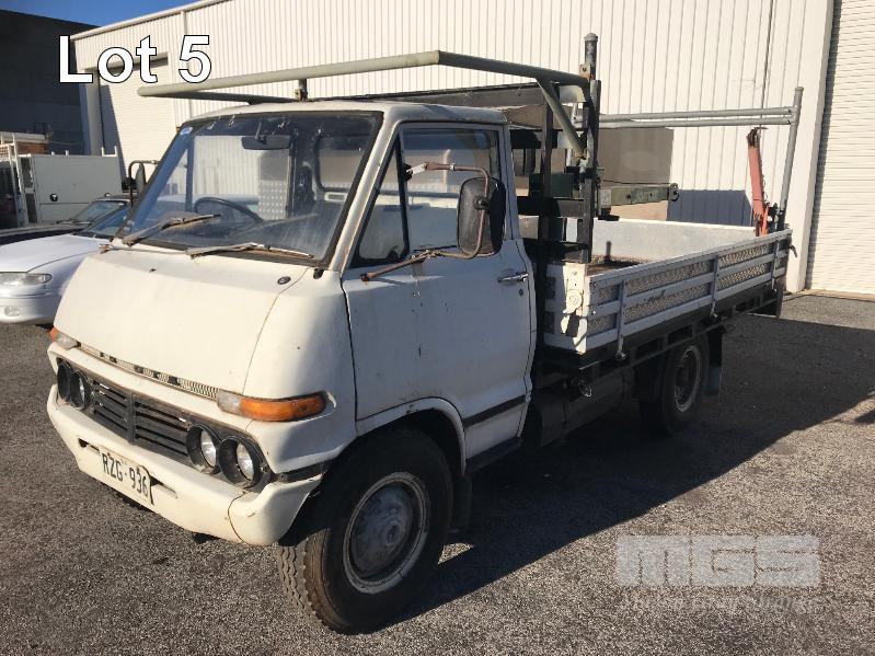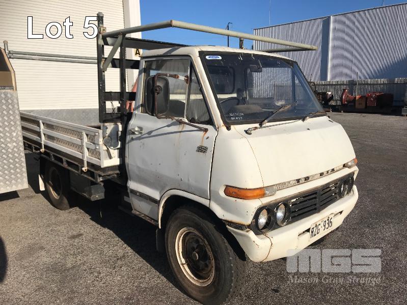 1970 TOYOTA DYNA 2000 4 X 2 TRAY TRUCK REG: REG 936 (SA) VIN: RU10-004986 ENG: 5R997433 ODO: 17,877 MILES GVM: 3,740 kg GCM: 4,860 kg ON THE TREE 4 SPEED MANUAL, SPRING SUSPENSION, WHITE, 7.50 R16 2 DOORS, 3 SEAT, STEEL TRAY, 300 x 220cm TRAY, 2 x MAUAL HOISTS CARRY BARS WITH OVERCAB FRAME, UNDER TRAY TOOL BOX REAR STEP KEY #28 (WITH PAPERS, WITH 1 KEY/S, NO OWNER'S MANUAL, NO SERVICE BOOKS)