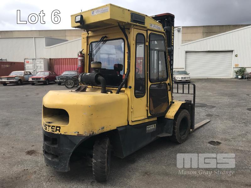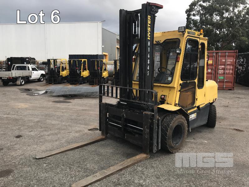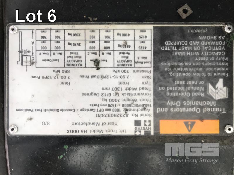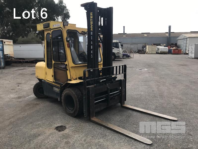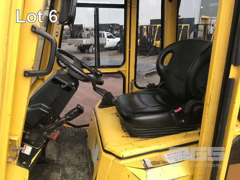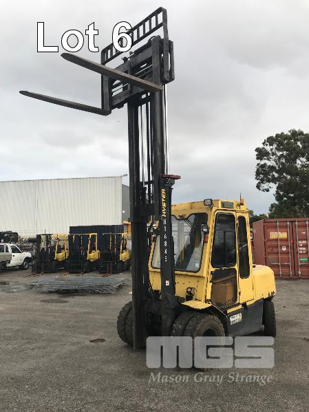 2006 HYSTER H500DX FORKLIFT HOURS: 17,036hours 6 CYLINDER, DIESEL, 5 TONNE S/NO: A232R03232D 2 STAGE MAST SIDE SHIFT TYNE ADJUST ENCLOSED FLOATING CAB A/C 3 SPEED MONOTROL PEDAL SOLID TYRES ISOLATOR EXTINGUSIHER KEY #43
