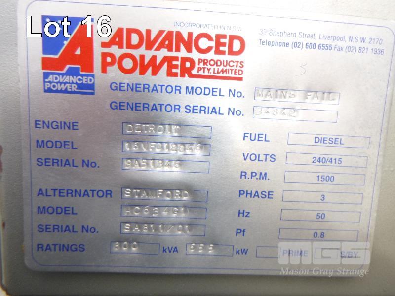 STANDBY GENERATOR, ADVANCED POWER MOD: MAINS FAIL 800KVA S/NO: 34842 DETROIT TWIN TURBO SUPERCHARGED V16 DIESEL STAMFORD 655kw ALTERNATOR 240/415V, E-STOP STEEL FRAME BASE, LIFTING LUGS